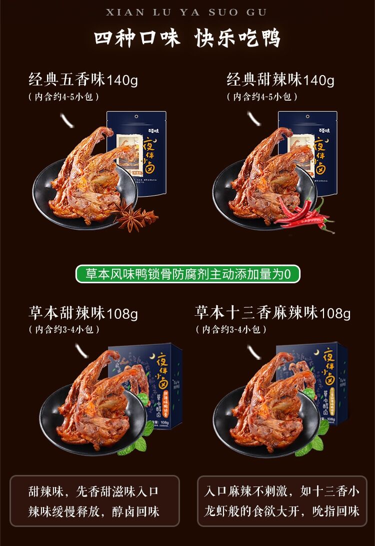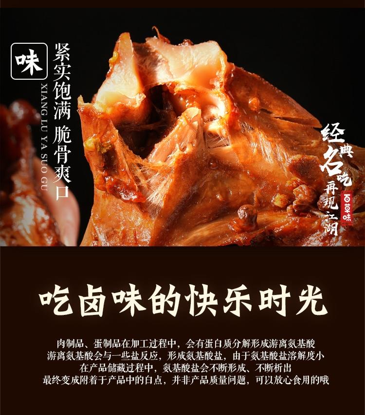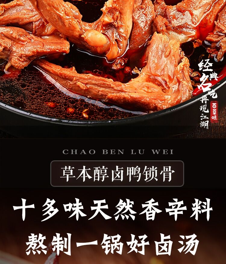 经典风味鸭锁骨,匠心配比,浓郁卤汁 ,十多味天然香辛料熬制一锅好卤汤,色泽红润,肉香浓郁,紧实饱满,脆香爽口,加班小累快来一包加油!