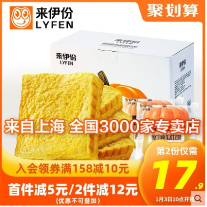 零食特产、酒水饮料 > 面包 > 来伊份南瓜吐司750g面包整箱 早餐 营养养胃 早餐食品 早餐面包