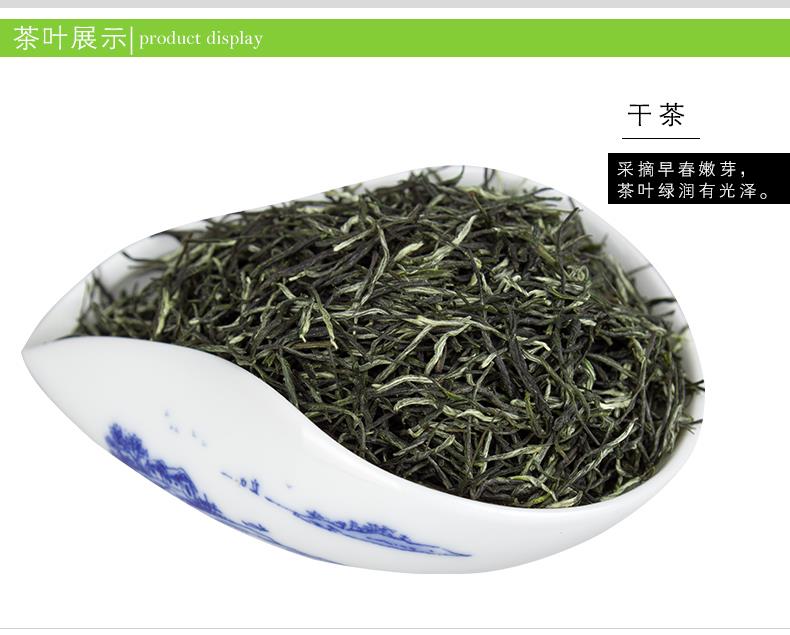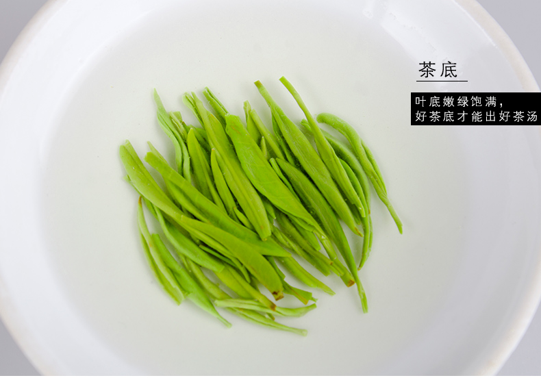 干茶:条索舒展,扁平挺直似针形,色泽墨绿,茶香浓郁。
