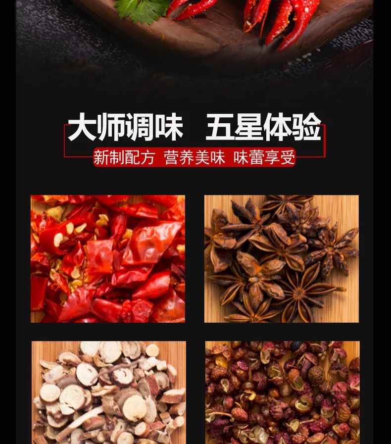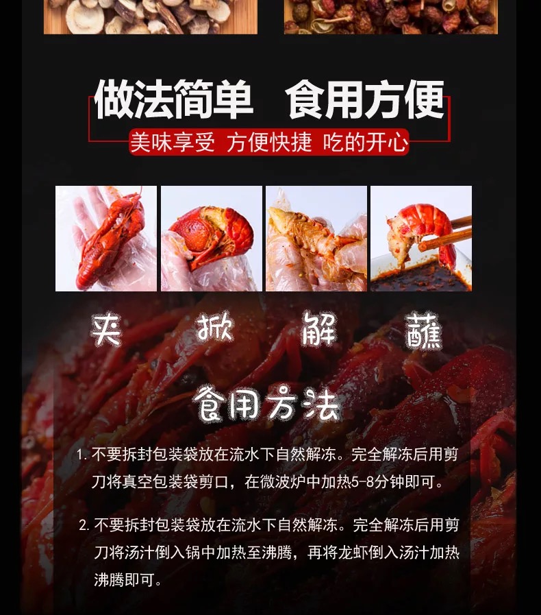 配料:小龙虾,植物油,花椒,白砂糖,食用盐,辣椒,料酒,辛香料