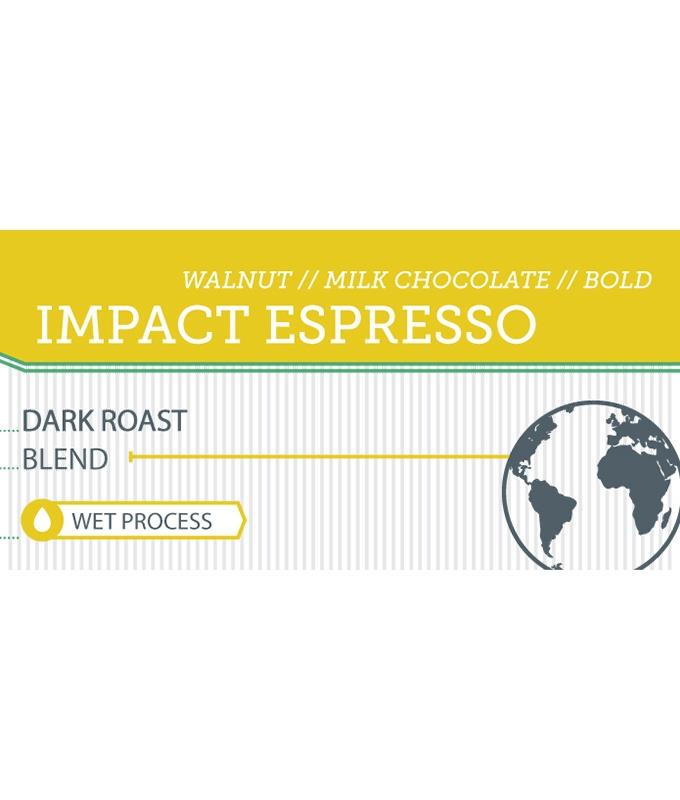 Wonderful aroma with a rich sweetness, notes of walnut, and a hint of smokiness. Impact Espresso consists of our Mexico Chiapas SHG, Brazil Santos, Colombia Excelso, and Guatemala Antigua all brought to a Dark Roast. This blend is great for espresso machines, drip brewers, or your favorite pour over.