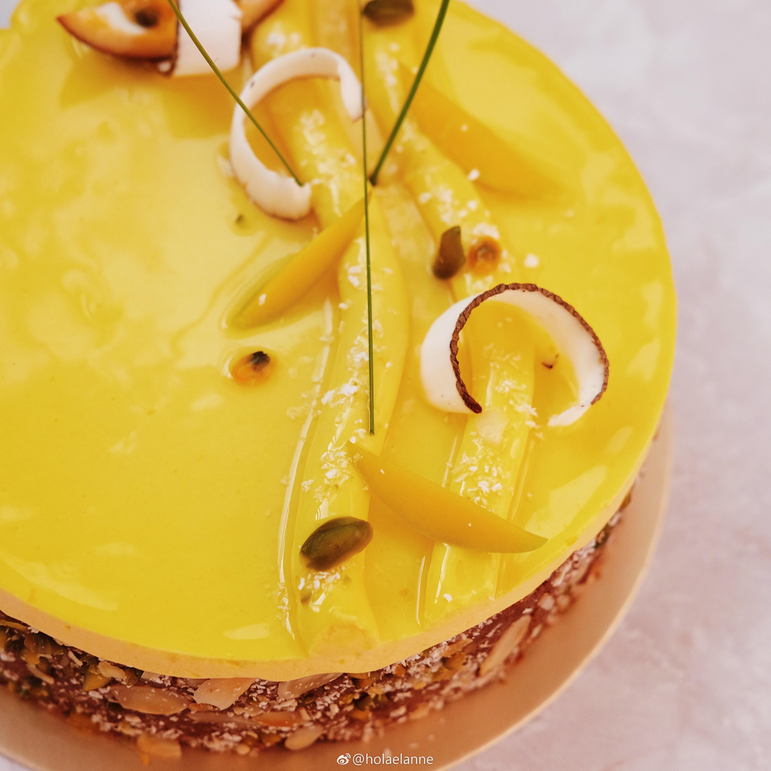 表面一层亮面芒果慕斯,包裹细腻的红丝绒蛋糕,中间还有在满满奶油中包裹的大块芒果,酸甜的水果味是夏天的味道。