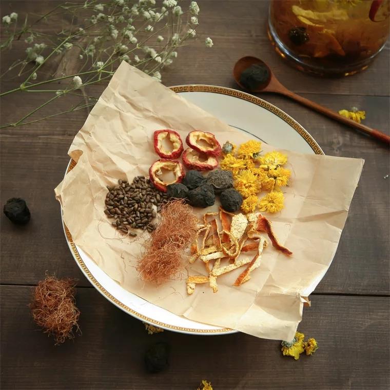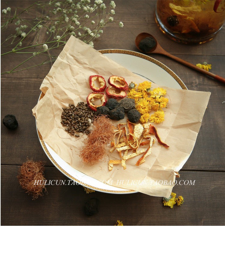 原料:黄贡菊 乌梅 陈皮 山楂干 玉米须 决明子