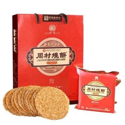 山东周村烧饼,是一道面食,因产于山东省淄博市周村而得名,源于汉代,成于晚清,是山东省名优特产之一。以山东省传统工艺精工制作而成,为纯手工制品,有“酥、香、薄、脆”四大特点。其外形圆而色黄,正面贴满芝麻仁,背面酥孔罗列,薄似杨叶,酥脆异常。入口一嚼即碎,香满口腹,若失手落地,则会皆成碎片,俗称“山东瓜拉叶子烧饼”。