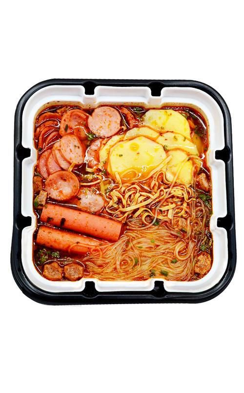 2.将底料料、蔬菜包、肉包、宽粉等拆开依次平铺放进上层餐盒里。