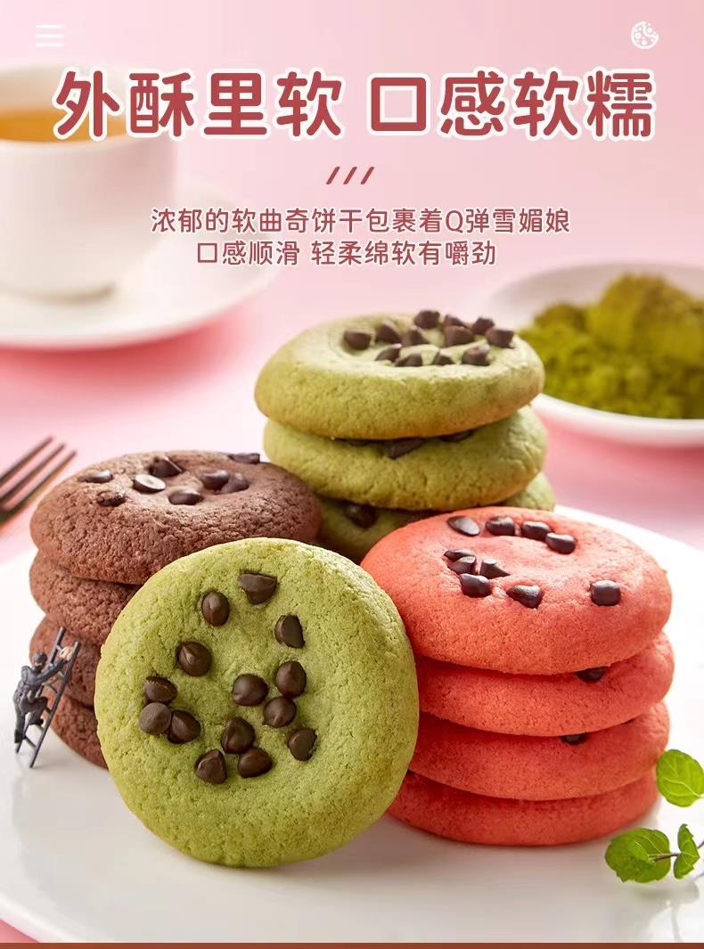 软曲奇饼身嵌大颗巧克力豆,咬一口曲奇碰撞出柔滑,醇香火花。