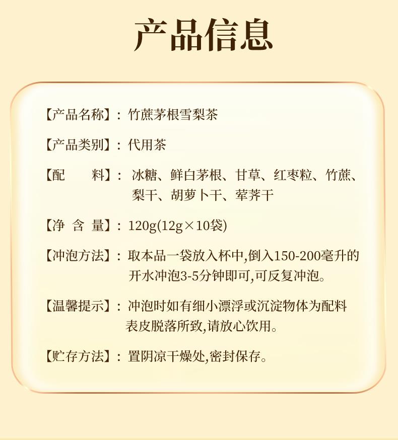 生产日期:2022年09月01日 至 2022年09月05日种类:竹蔗茅根雪梨茶*1盒 竹蔗茅根雪梨茶*2盒 竹蔗茅根雪梨茶*3盒 竹蔗茅根雪梨茶*5盒 【组合装】雪梨茶*2盒 秋梨膏*1瓶 大品牌 高质量 宝宝更爱喝品牌:同仁堂