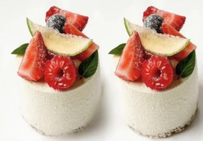 yuzebakery cake:采用新鲜奶油和面粉制成蛋糕层,一层蛋糕层搭配一层水蜜桃和苹果切片为夹心,蛋糕上方淋上草莓酱,草莓酱上方有柠檬和小块饼干作为装饰