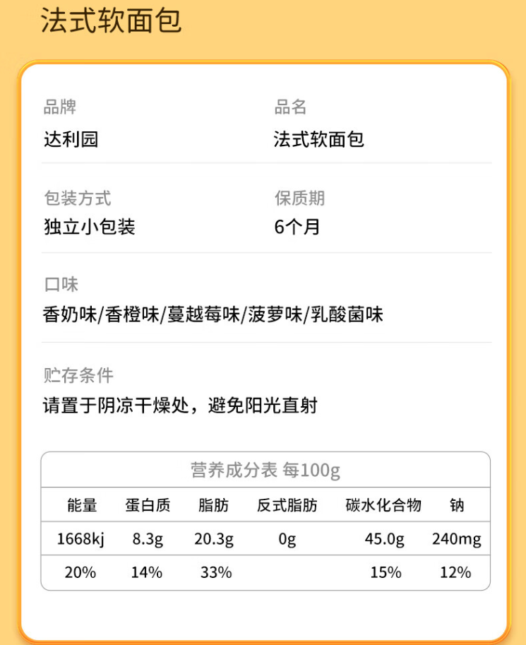 生产日期:2022年09月01日 至 2022年10月31日品牌:盼盼系列:软面包香奶味1.5kg 口味:软面包香奶味-1500g/箱(约70枚左右) 软面包香橙味-1500g/箱(约70枚左右) 软面包香奶味600g常规礼盒装(约30个) 软面包香橙味600g礼盒装(约30个) 软面包香奶味-360g*袋 软面包香橙味-360g*袋 法式小面包香奶味-1500g/箱【超值装约70包左右】 【买一箱送一箱】软面包香奶600g/箱+香橙600g/箱包装种类:箱装产地:中国大陆 省份:福建省是否为有机食品:否面包类型:软面包 包装方式:包装糕点种类:面包总净含量:0g 储存条件:常温生产许可证编号:SC12734050100017厂名:马鞍山达利食品有限公司 厂址:安徽省马鞍山市经济技术开发区湖西南路166号厂家联系方式:0595-87297030保质期:180天