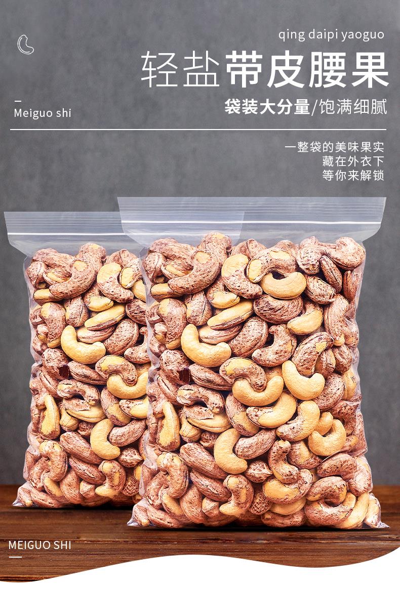 食品口味:~~~精选2023新货带皮腰果,只卖净含量~~~ 【大颗粒·半斤】新货:净重250g*1包(体验装) 【大颗粒·1斤】新货:净重250g*2包 【大颗粒·2斤】新货:净重250g*4包 【特大颗粒·1斤】新货:净重250g*2包(精选A180级) 【特大颗粒·2斤】新货:净重250g*4包(精选A180级)净含量:500g包装规格:1袋