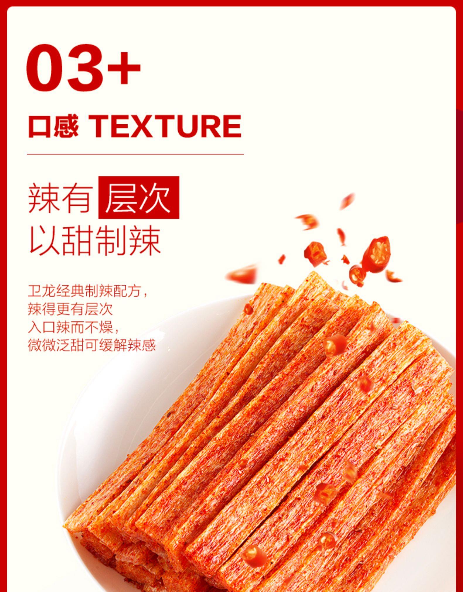 卫龙辣条陪伴绝大多数80.90.甚至00后,一起长大,香辣浓郁,蓬松筋道,独特的口感和味道让人停不下来,这也成为了许多人记忆中最熟悉,最幸福童年的味道。