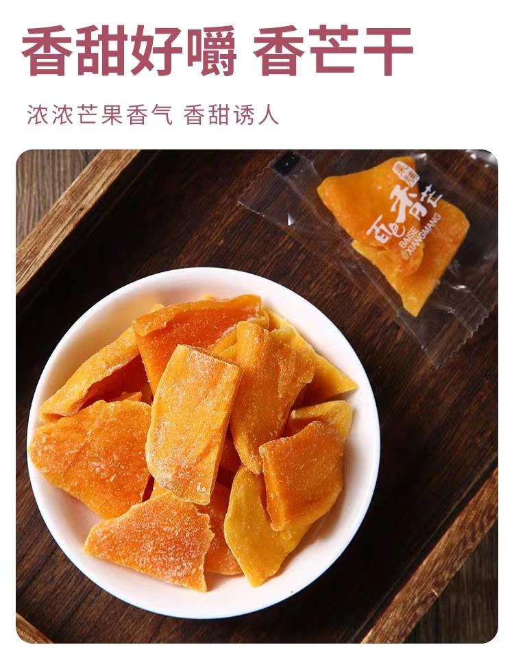芒果干口感:芒果干的口感香甜可口,丝毫不输新鲜芒果。它不仅有着浓郁的果香,还有一种特殊嚼劲,让人无法抵挡。