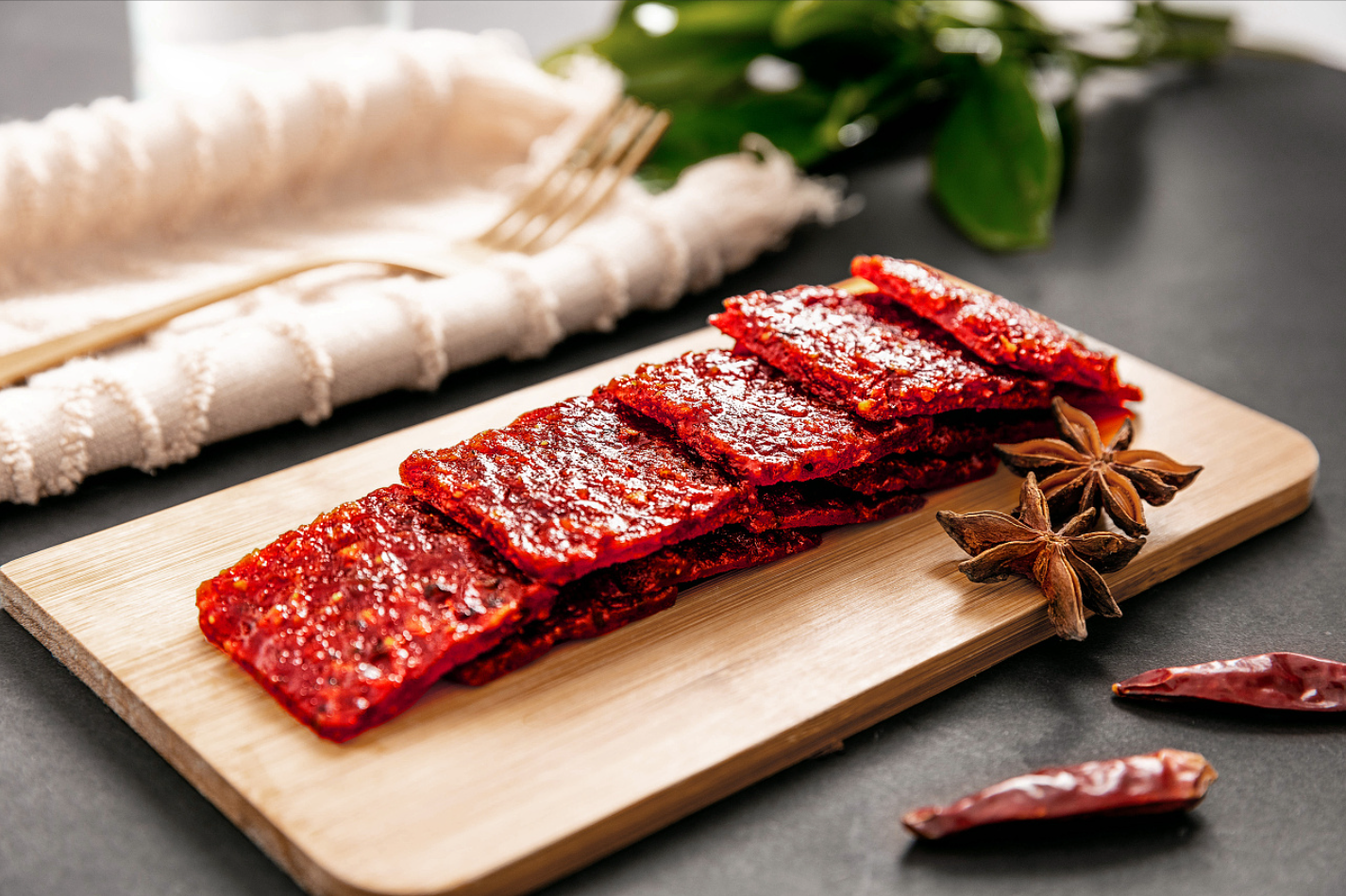 猪肉脯生产过程比较复杂而严格,选用的是新鲜猪肉后腿部分,剔去皮、膘、筋骨,取其整块纯瘦肉为基本原料,剖成薄片。然后,将配以白糖、味精、特级鱼露、鸡蛋等几十种佐料涂在肉片上,其中鱼露一味至关重要。之后,再将肉片平摊在一种特制的筛匾里烘烤。先后要经过片肉、拌料、摊筛、脱水、烘烤、压平、修剪、装箱等十几道工序,才成为那一片片色、香、味、形俱佳的肉脯,方可出厂上市。