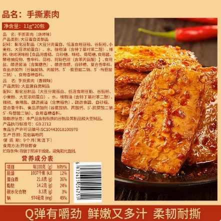 包装规格:1袋单件净含量:220g品名:手撕素肉