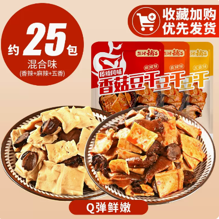 品牌:盐津铺子系列:香菇豆干2.0口味:尝鲜【12包】混合3味240g(买6送6) 【25包】混合3味500g(买13送12) 推荐【50包】混合3味1000g(买25送25) 【75包】混合3味1500g(买38送37) 囤货【100包】混合3味2000g(买50送50) 【12包】香辣味240g(买6送6) 【25包】香辣味500g(买13送12) 【25包】麻辣味500g(买13送12) 【25包】五香味500g(买13送12) 【50包】混合2味1000g(香辣送五香味 ) 【50包】香辣味1000g(买25送25) 【50包】五香味1000g(买25送25) 【50包】麻辣味1000g(买25送25) 【75包】香辣味1500g(买38送37) 【75包】五香味1500g(买38送37) 推荐【150包】混合3味3000g(买75送75)