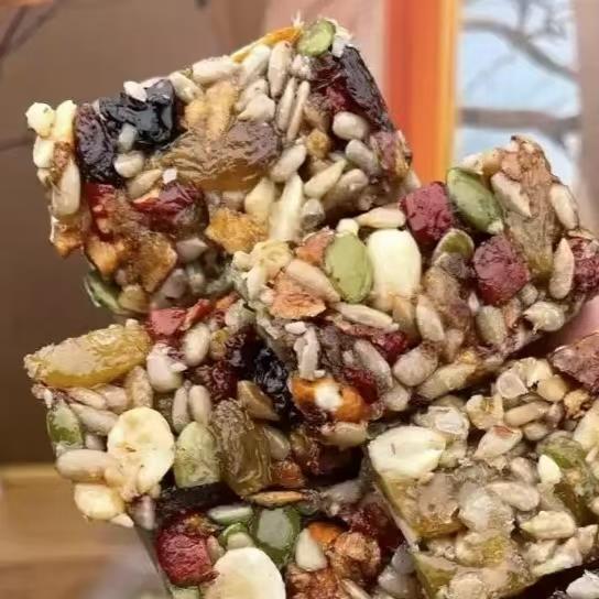 新疆切糕是新疆地区的一种传统特色美食。它主要是由多种坚果(如核桃仁、巴旦木、腰果等)、果脯(如葡萄干、红枣干等)和糖浆(通常是由麦芽糖、葡萄糖浆等熬制而成)制作而成。这些丰富的原料经过熬糖、混合、压制等工艺,最终形成质地紧实的糕状食品。
