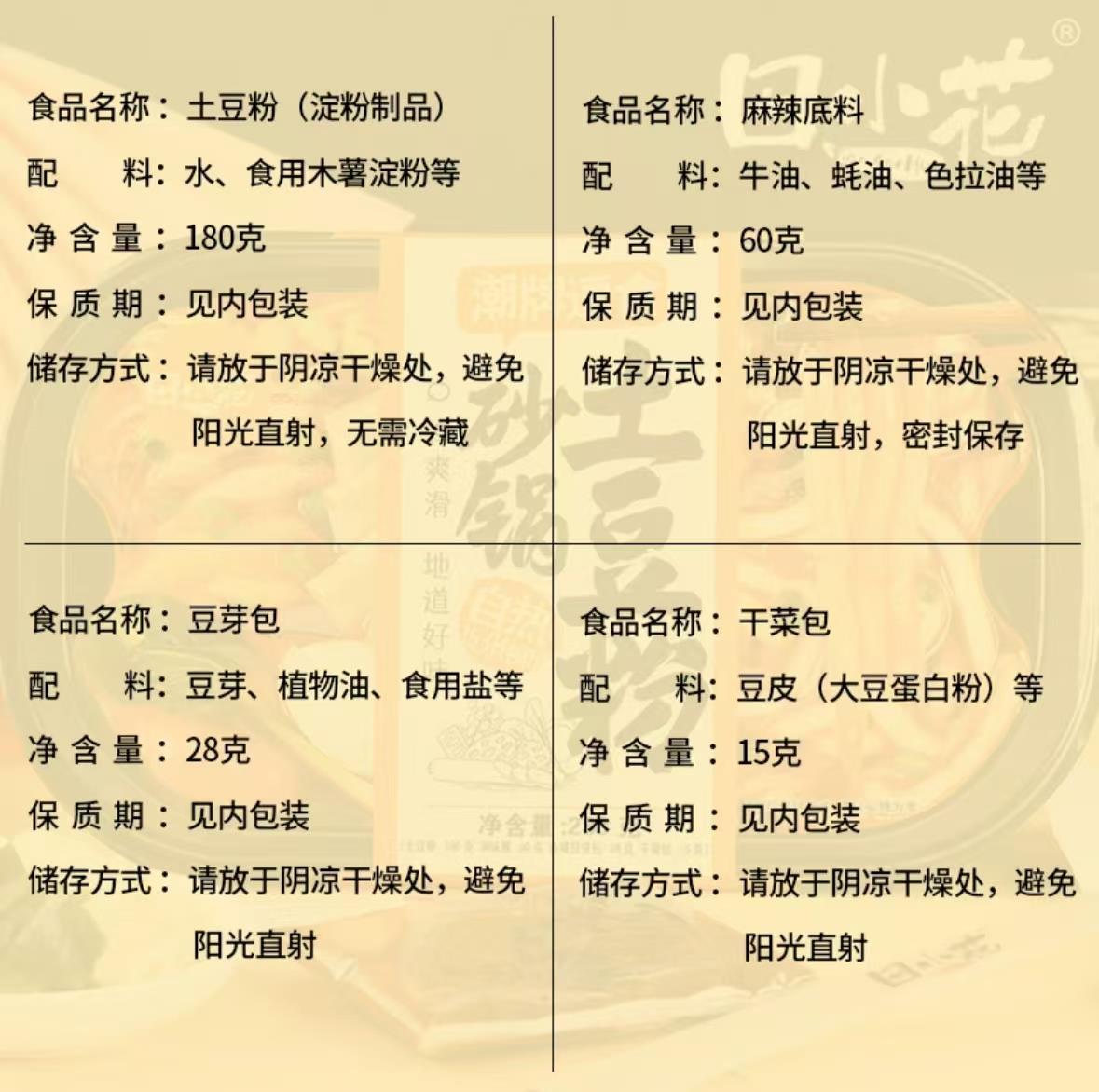 产品描述:内含土豆粉包、调料包等,采用砂锅烹饪理念,自热技术快速加热,口感酸辣鲜美,