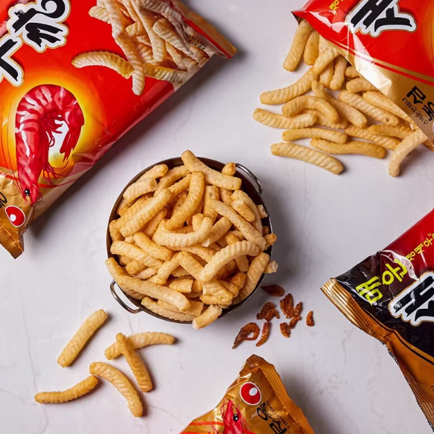 原味虾条90g,辣味虾条90g,农心章鱼片90g,农心香蕉脆果75g
