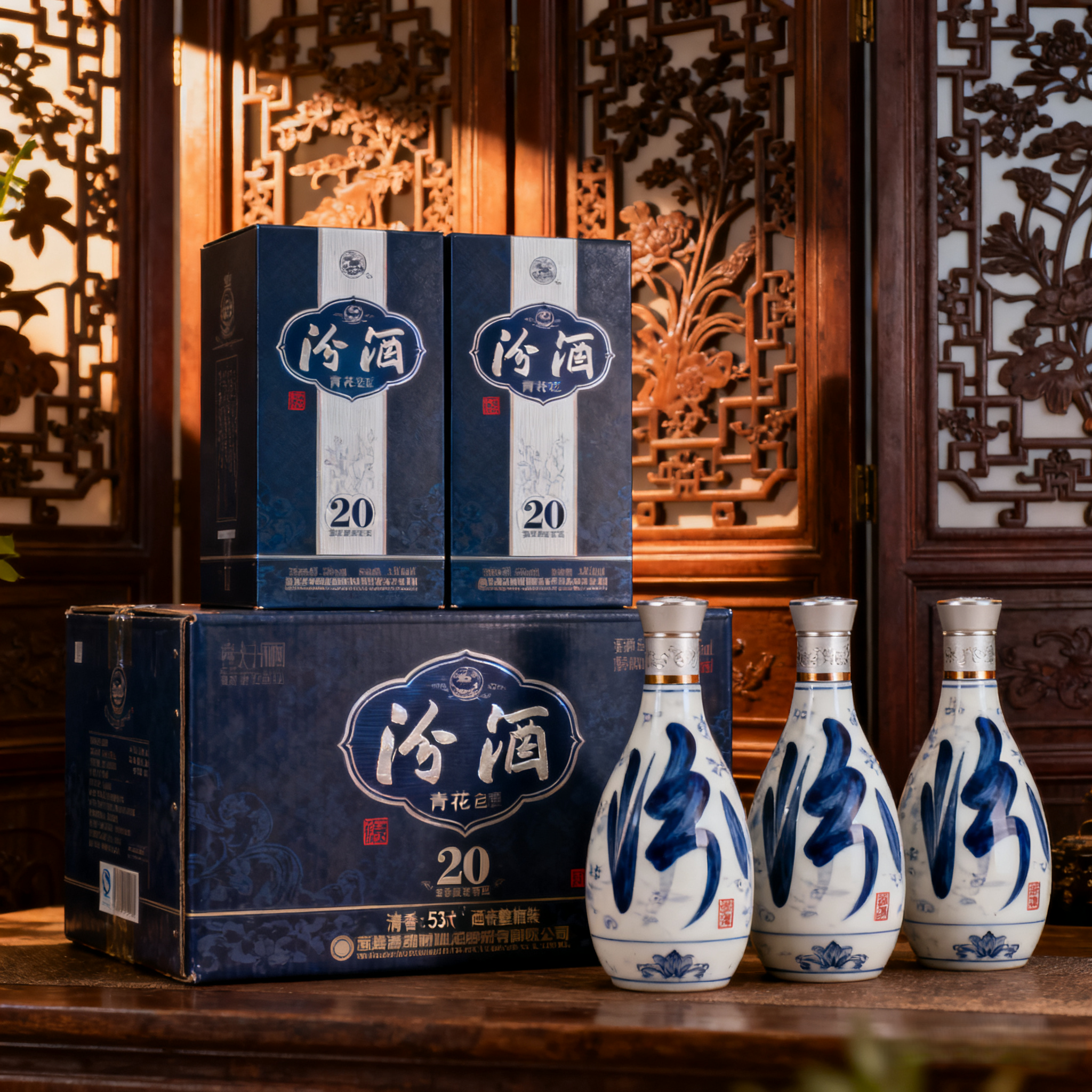 瓶身:青花瓷材质,手工书写 "汾" 字,3D 微凸印刷青花缠枝纹