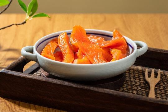 外观与口感:地瓜干呈诱人的琥珀色或深褐色,质地柔韧有嚼劲,表面裹着一层薄薄的糖霜,却不黏手。入口先是清甜的薯香,后味带着地瓜本身的甘醇,软糯不齁甜,越嚼越有风味。