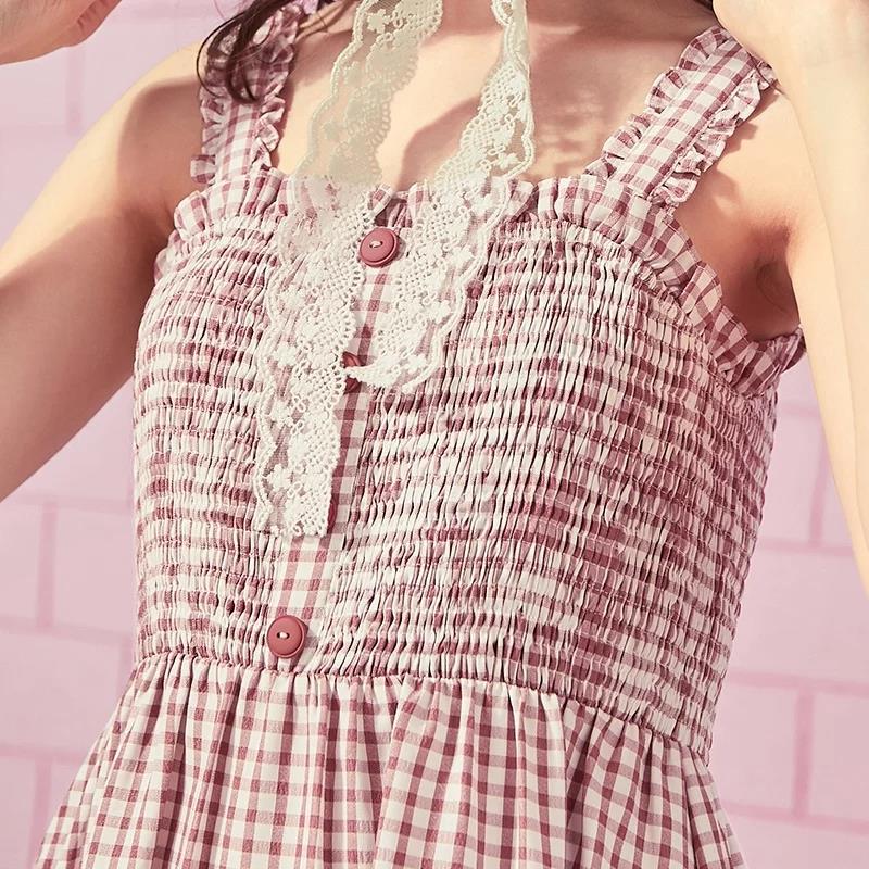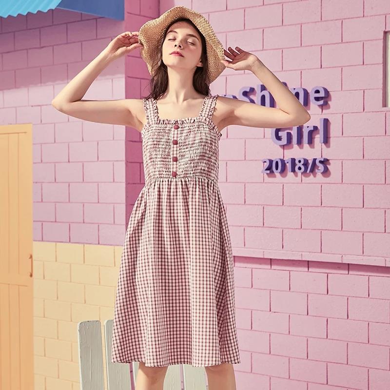 2018夏季新款韩版女装学生格纹单排扣吊带露肩露背连衣裙预售