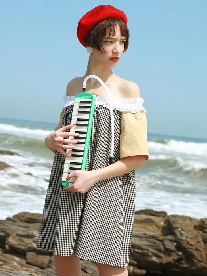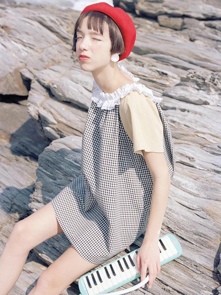 独立设计少女感格纹chic一字肩花边拼色两穿宽松连衣裙