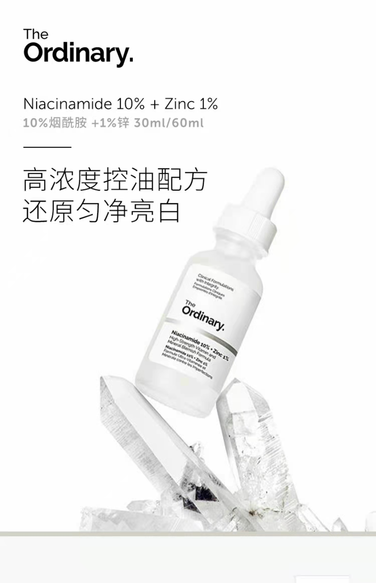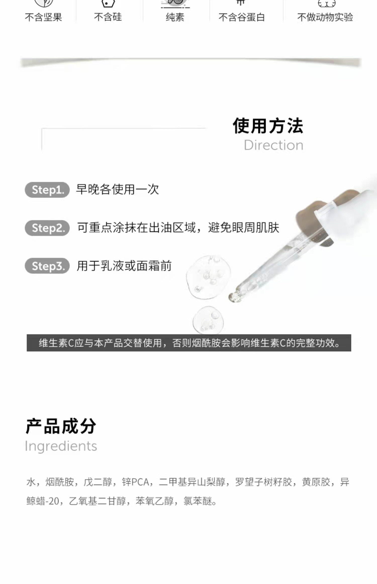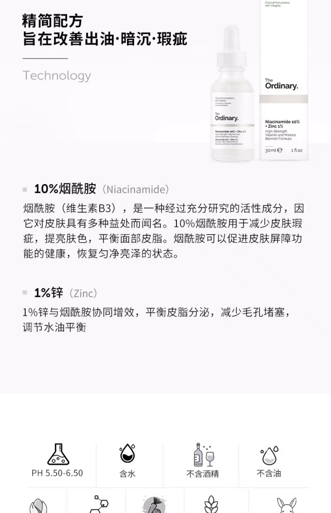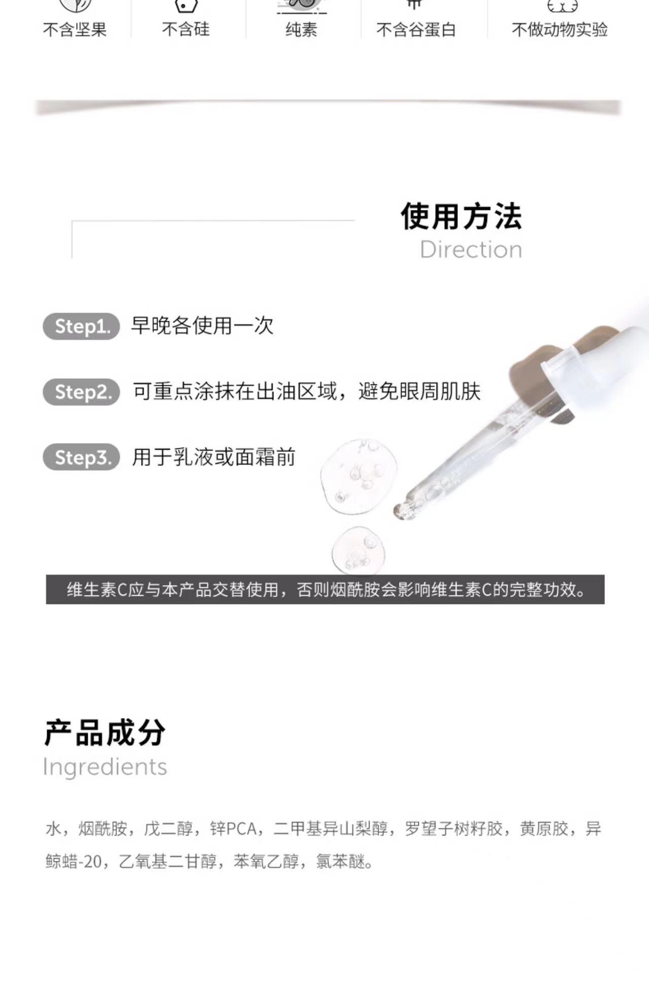 1%锌与烟酰胺协同增效,平衡皮脂分泌,减少毛孔堵塞,调节水油平衡