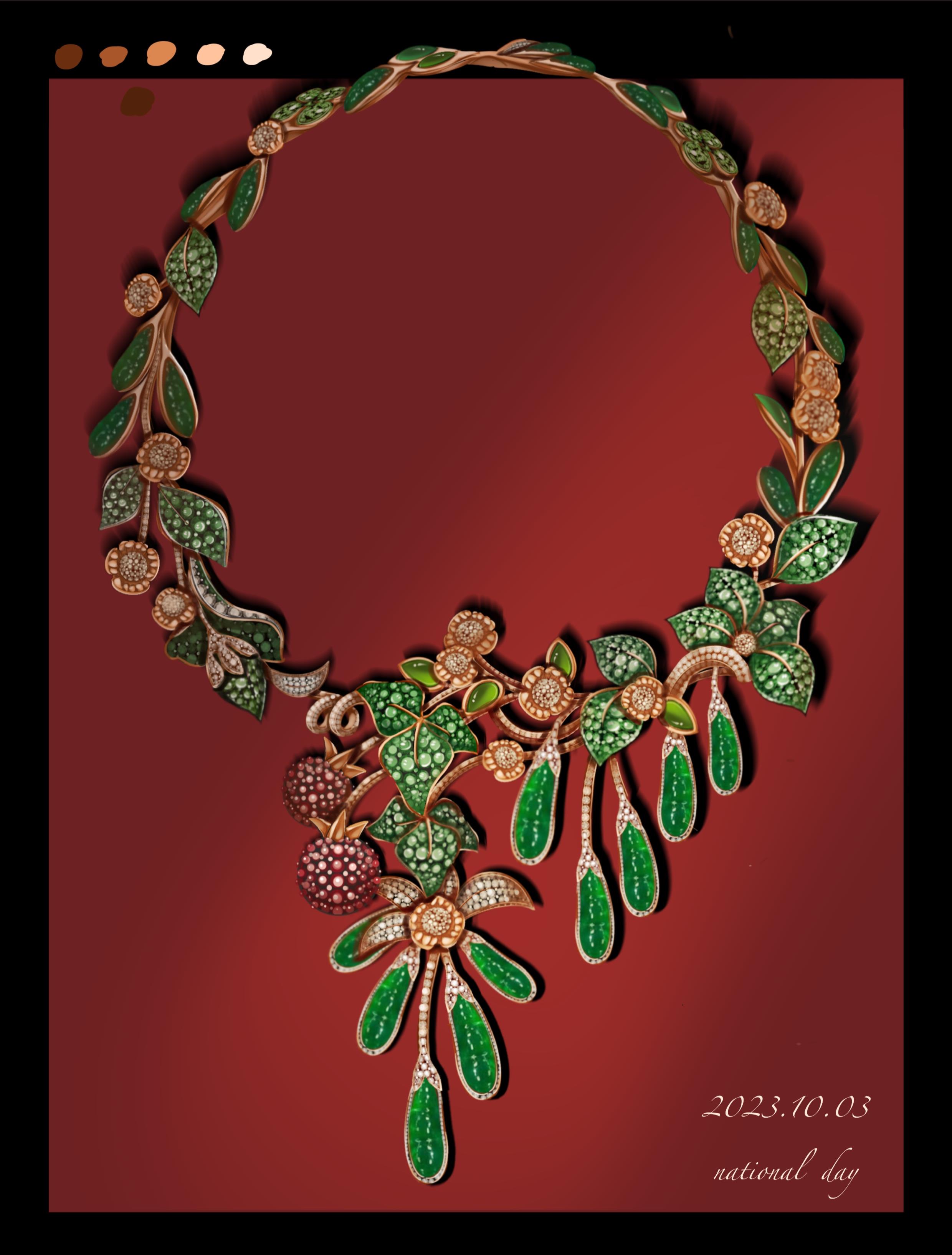 项链中包含了数十颗福豆形式的绿种翡翠以及用上百科钻石镶嵌的荔枝与枝叶,在展现无比美妙生机勃勃的同时,这组合不缺乏独特的美感