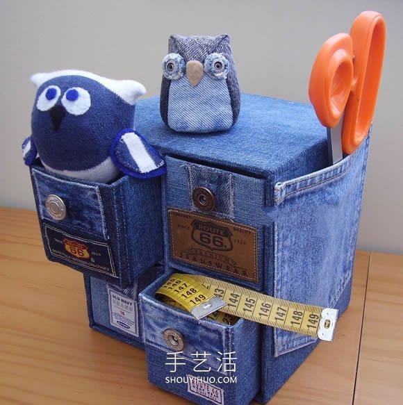 由牛仔裤改造的可以放在桌面上放小零碎的收纳柜