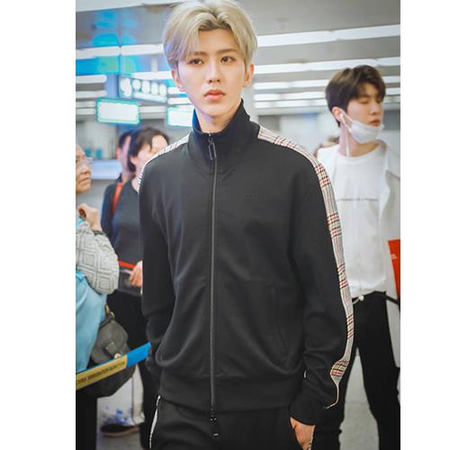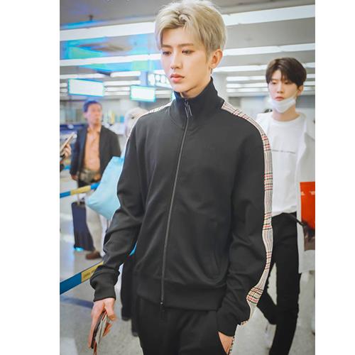 家居用品、厨卫清洁 > 内衣 > 蔡徐坤机场同款春秋款男女情侣黑色拼格子立领休闲运动潮流套装男