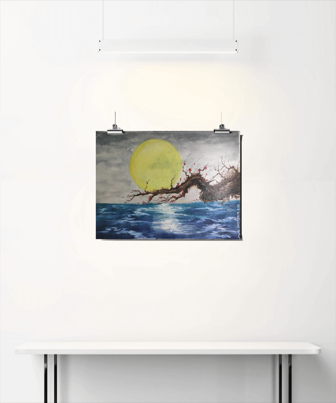 那蔚蓝海面的另一边,越过那开着粉红花朵的枝条,就能看见一轮皎洁的明月。