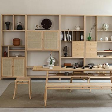 不同空间布局满足各种使用场景,可实现四款不同款式自由组合,柜门嵌入印尼六角编藤,通透独特且黑与白的视觉反差,独具清雅文人风骨。