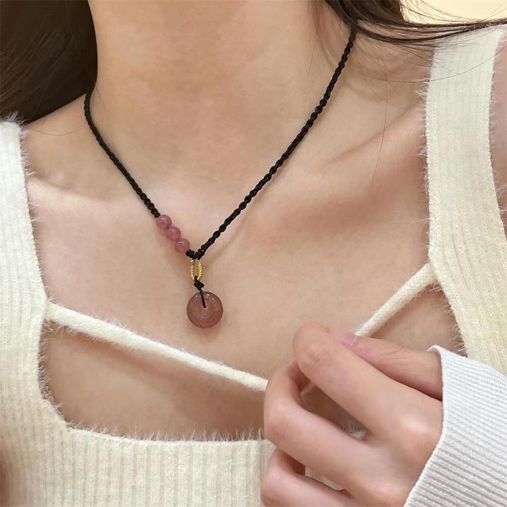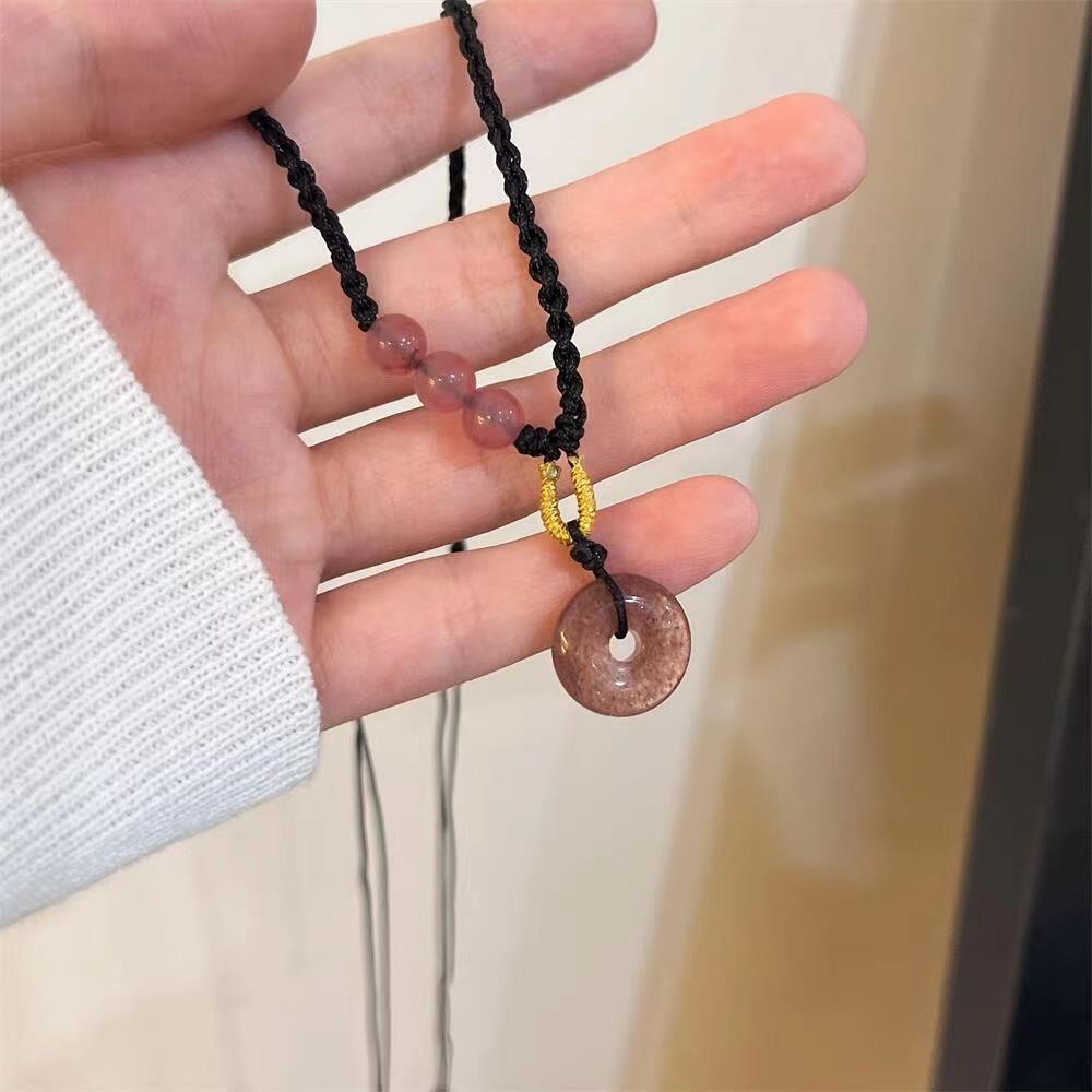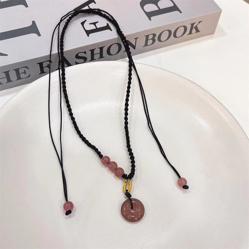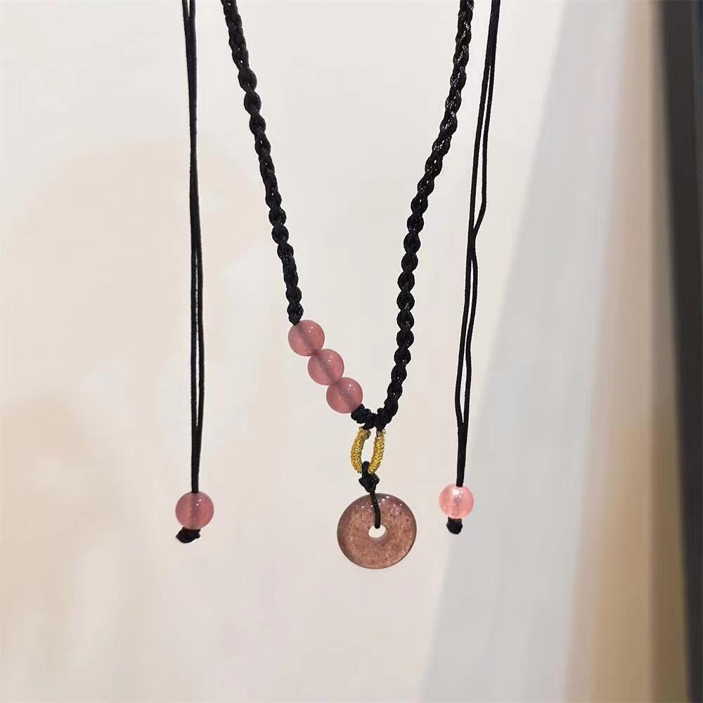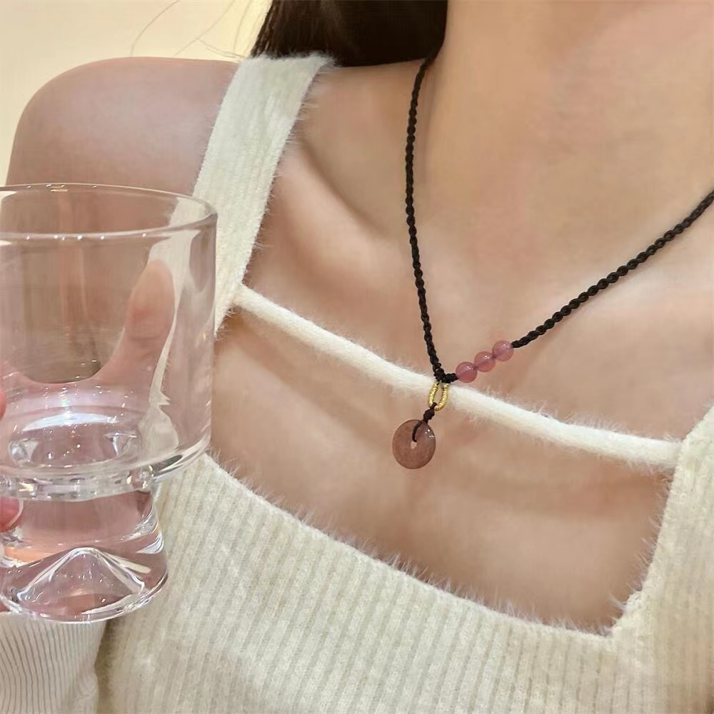 新款草莓晶平安扣编织吊坠黑绳项链女夏锁骨链轻奢小众高级设计感