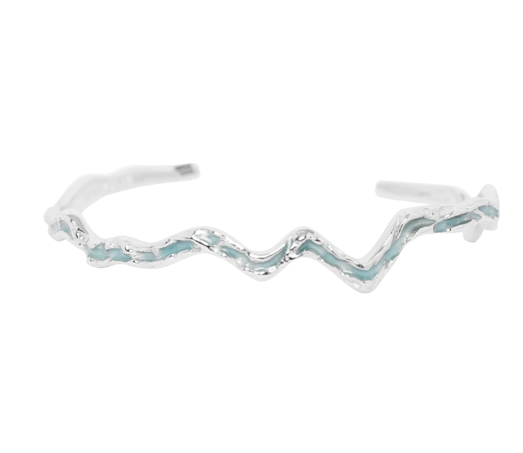 《海域》系列透过对大海形象的想像,去联想到相同性质的情绪体验。设计中以延伸水滴的形态,比作对未知边界,即内在世界的探索。海水与天空相间的蓝色,则状似意识与情绪的关系:党察与被觉察者。而使用的海浪的水波纹理和鱼尾元素,便喻为跌宕消隐的神思以及对找寻“真我〞的寄意。