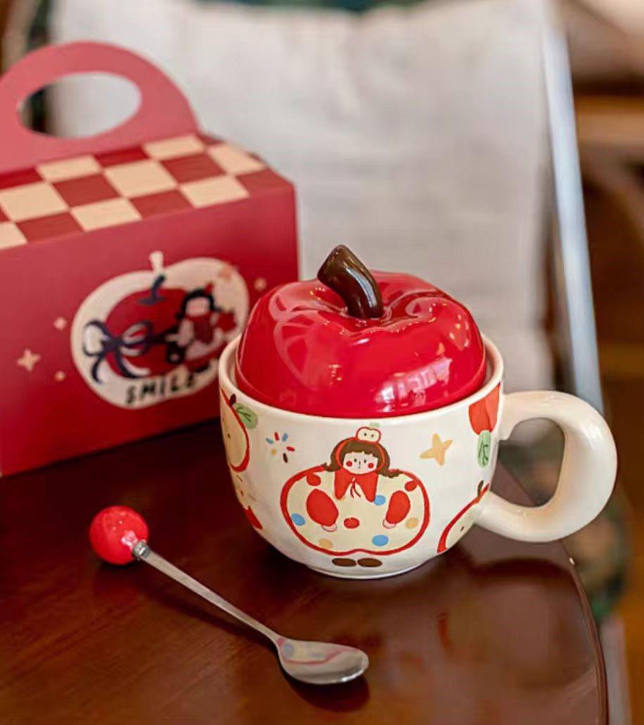 可爱苹果陶瓷马克杯自带盖勺早餐杯咖啡杯