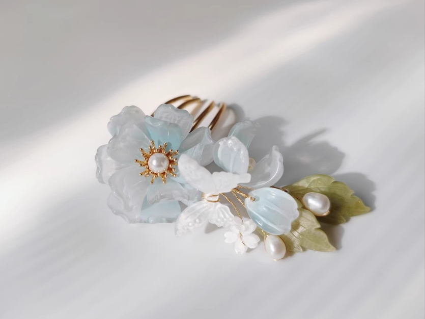 造型精美,花瓣剔透似真,色彩淡雅,钗身精致,插于发间宛如蝴蝶在发上栖息,灵动优雅。