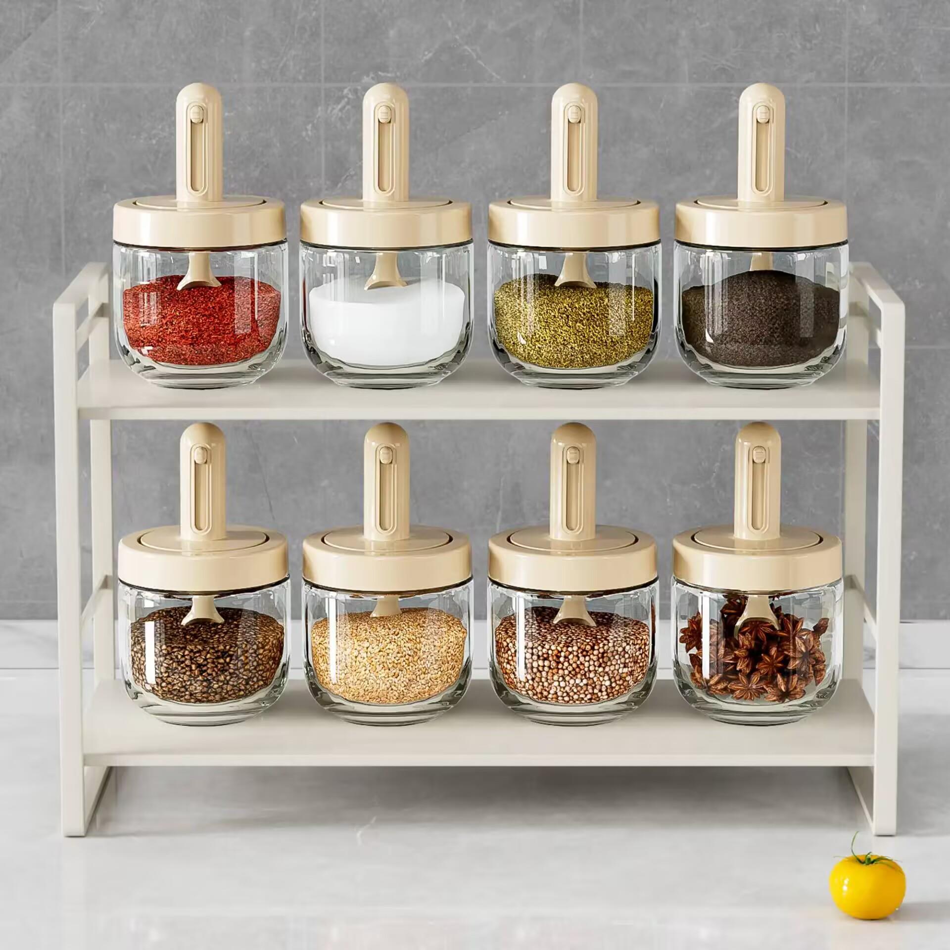 - 旋转调味架款:多个玻璃调味罐组合在旋转调味架上,节省空间,方便取用不同调料,使厨房整洁有序。