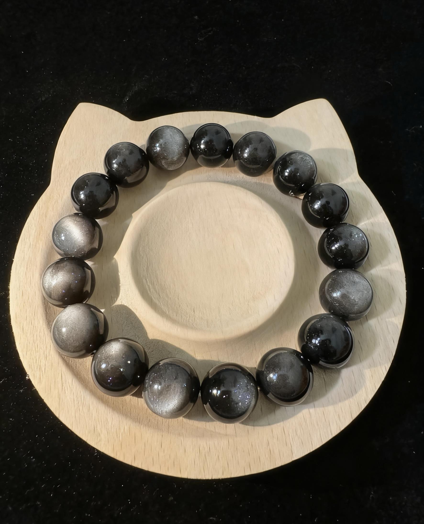 从能量寓意来看,银曜石被视为“黑曜石中的贵族”,有着强大的守护属性。它能帮助佩戴者抵御负能量的侵扰,如同随身的能量护盾,为你在繁杂的生活与工作中构筑安心的结界。同时,银曜石的能量还能助力佩戴者明晰思,在面对决策时带来冷静的判断,对于时常处于压力环境中的都市人而言,是不可多得的“心灵铠甲”。