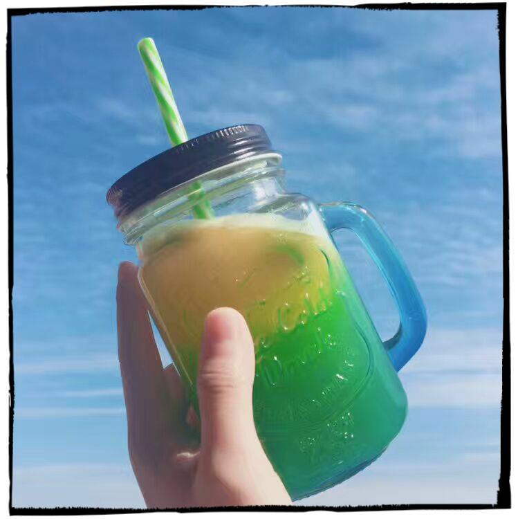 家居用品、厨卫清洁 > 餐具 > 渐变色公鸡杯创意带手柄吸管玻璃杯美式字母带盖个性果汁饮料杯子
