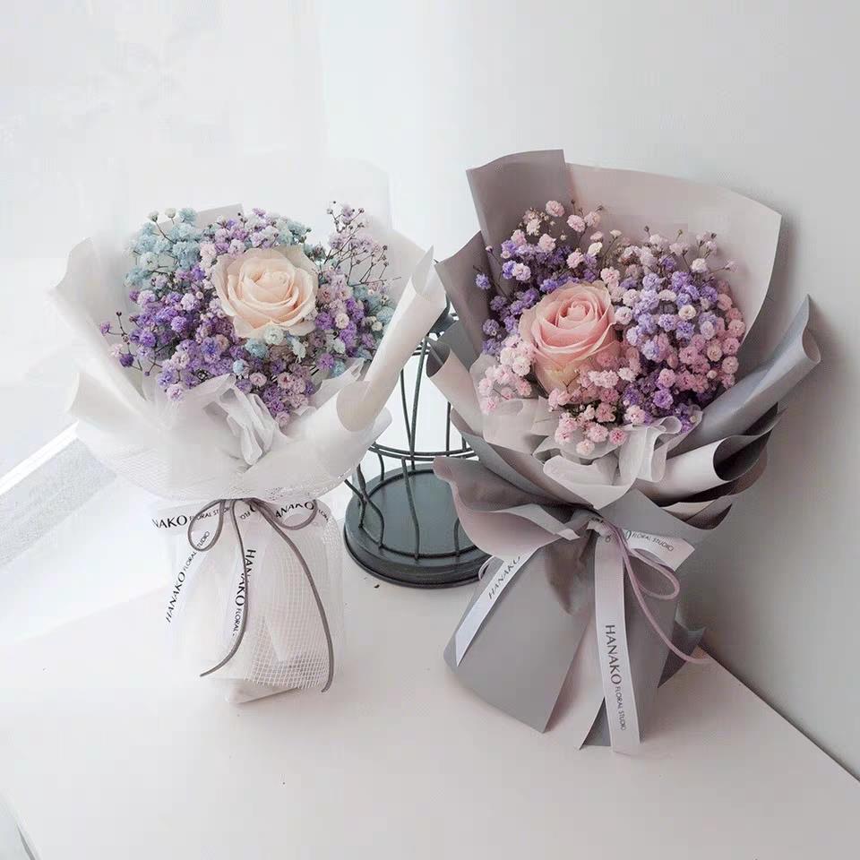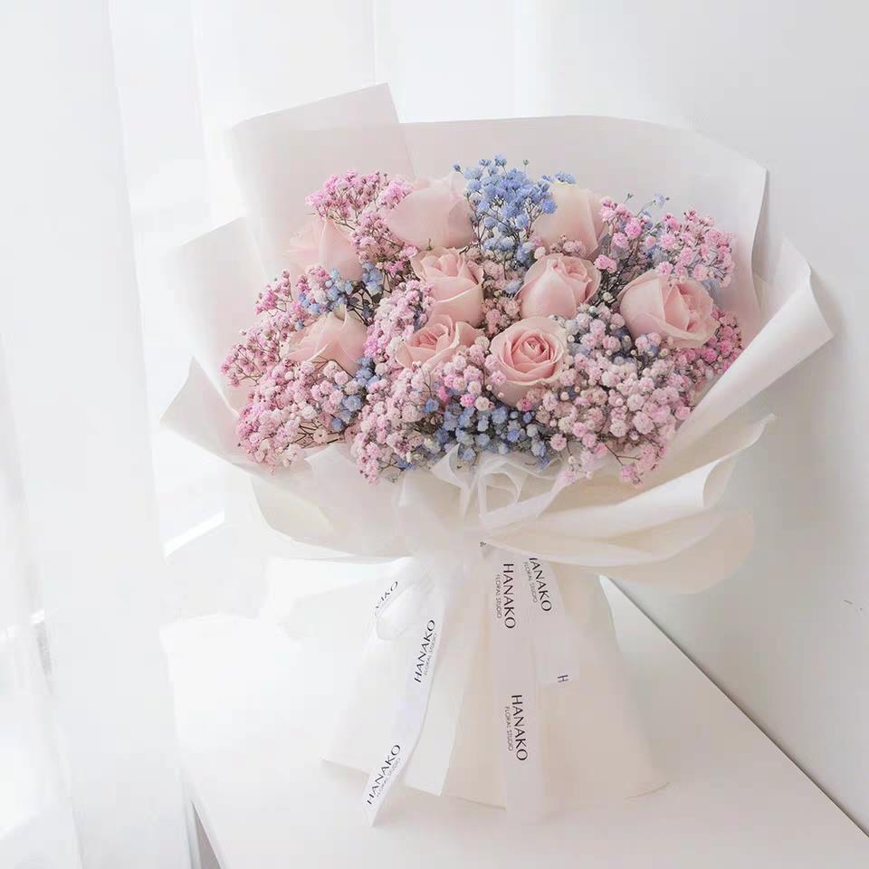 粉白玫瑰与满天星的组合,一点青涩,一点暧昧,适合赠与你心爱的她