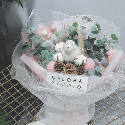 花束用材:白色木棉、尤加利叶(ps:尤加利叶具有干花属性,会变成干叶,颜色稍退,不喜勿拍)、松果、满天星、毛线球、串灯