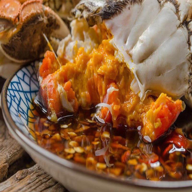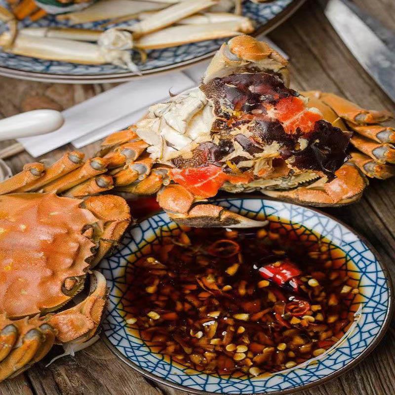 太湖蟹,生长于太湖水域,亦称螃蟹,其背壳坚隆凹纹似虎色青黑,腹青白色,腹下有脐,雄尖雌团,内有硬毛。蟹个大体重,蟹黄肥厚,肉质细嫩,腴美异常,辨别太湖蟹可从“青壳、白肚、金爪、黄毛、体壮”这五个特征入手。