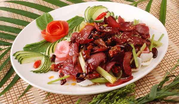 牛干巴是贵州常见的一种牛肉腌制食品,选取肥壮肉牛的后腿等部位的优质牛肉,辅以适量食盐、花椒等调料,采用搓揉、腌渍、晾晒、风干、煎炸等工艺,加工制作而成。可做小零食,也可做为菜肴食用。