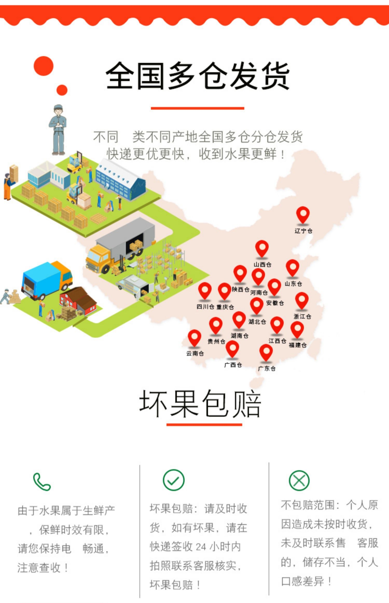 水果在运输过程中因为自身呼吸,会有小部分水分蒸发流失,收到后重量 可能会减轻,损耗在10%以内的视为正常,超出10%这个比例,超出损耗范围的部分按每斤均价进行理赔。