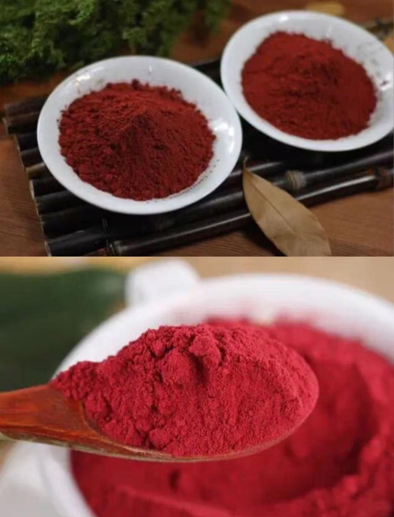 红曲米粉:由红曲米发酵加工而成,少量使用,加热后呈肉粉色,用量较多时,成品会呈红色或深红色,对!就是那个霸气的红丝绒色,但会有淡淡的红曲味道。
