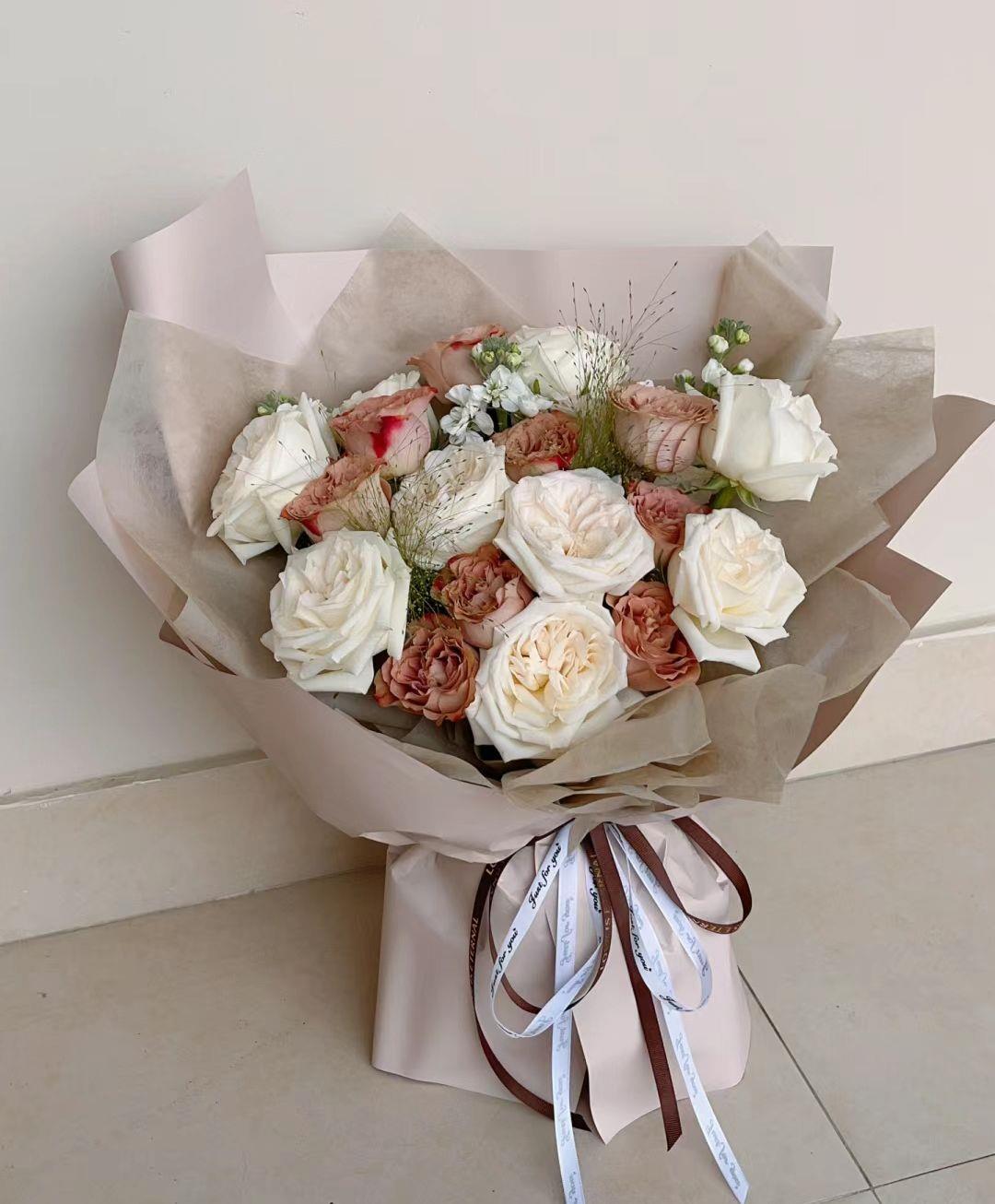 精选原料:本店的花束选用各种当季新鲜花卉,确保花束的品质和美观。