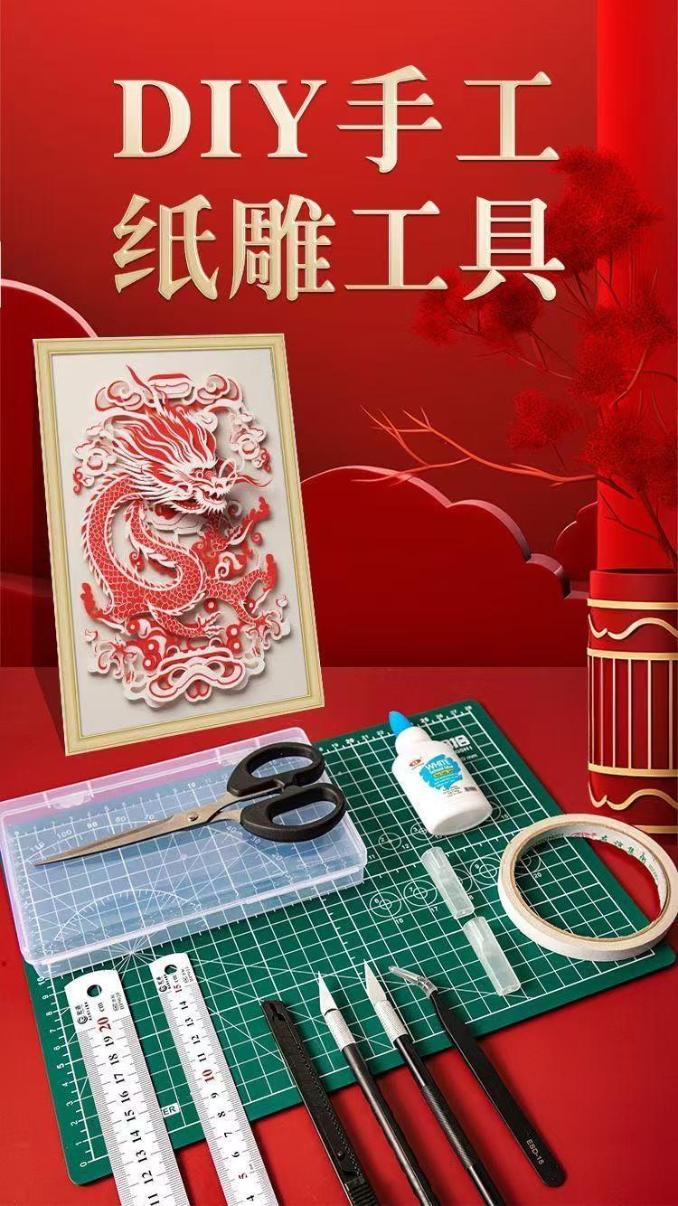 母婴用品、玩具 > 手工材料 > 纸雕制作工具刻刀垫板卡纸刻纸学生手工diy红色主题纸雕工具套装