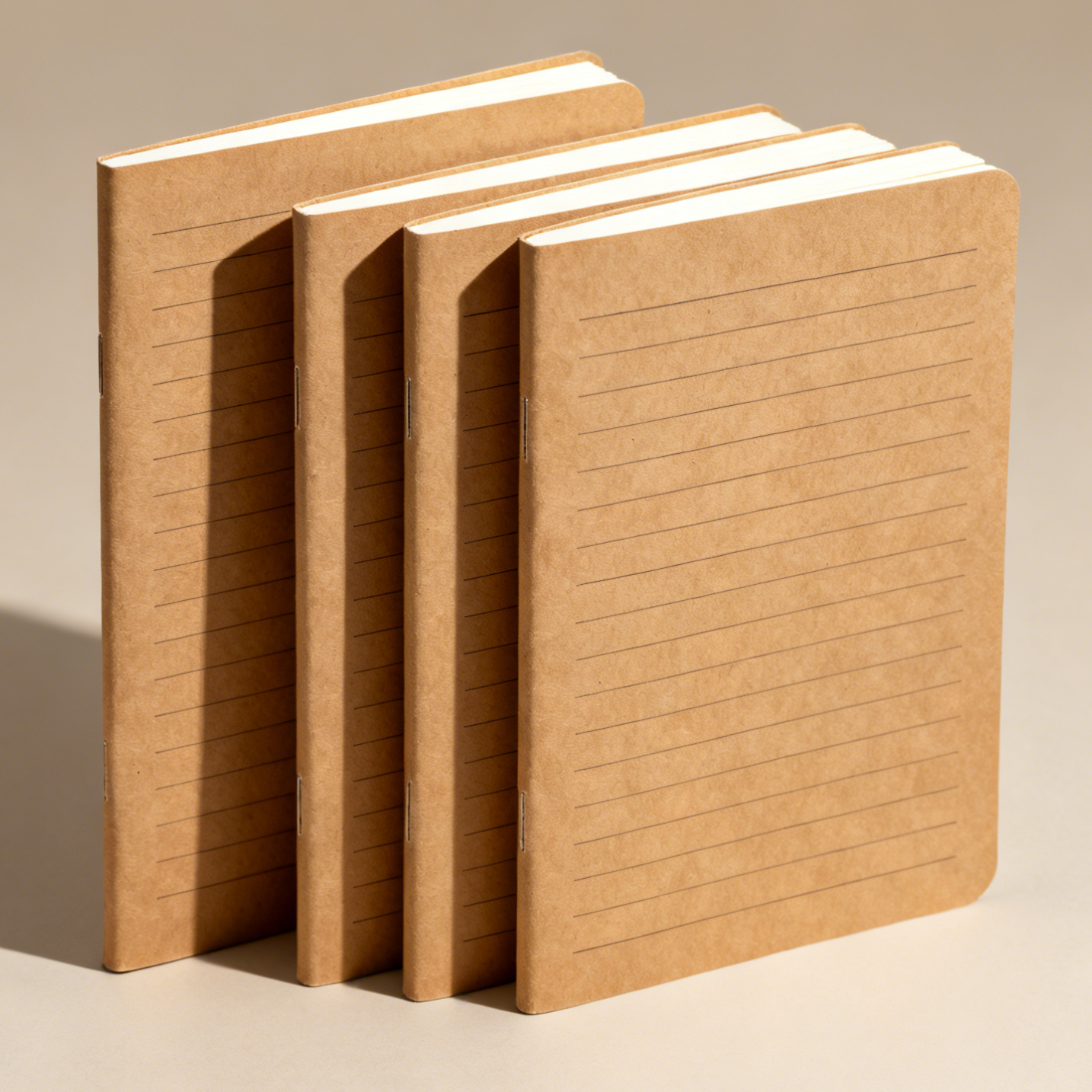 • 卖点:①牛皮纸封面耐磨防水;②横线内页,书写整齐;③可180°平摊,书写不硌手 • 规格:单本厚度8mm,4本装OPP袋包装