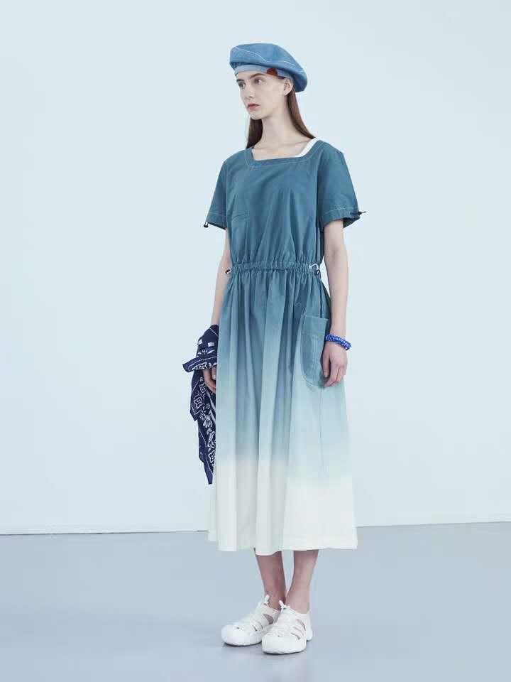 这条连衣裙我们采用了全棉面料,透气性强,柔软舒适,面料的颜色采用吊染的方式制成,古朴又自然,上身下浅的渐变,由海蓝色向白色的过渡,裙摆上的小贴图增加了一些可爱的感觉。