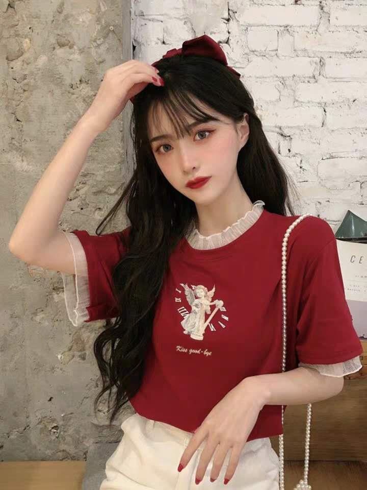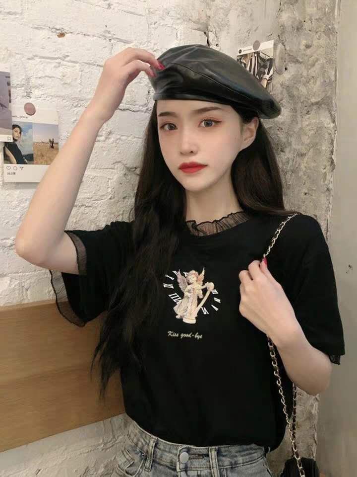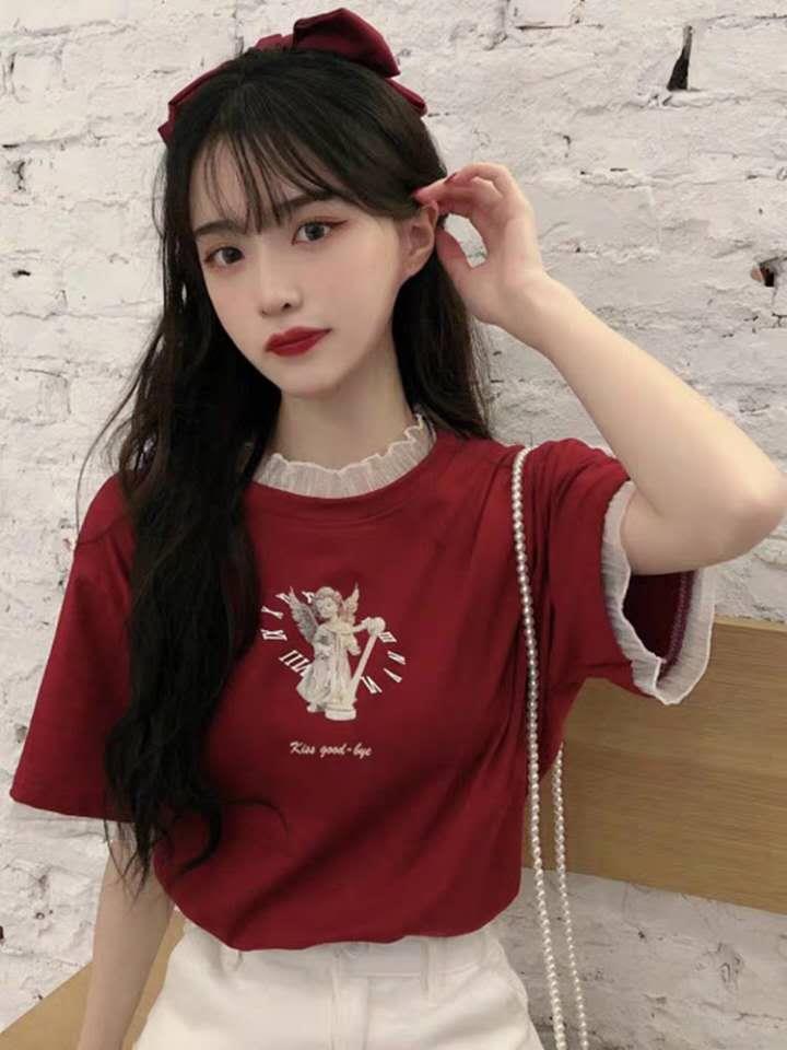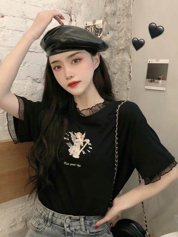 夏装2020新款复古法式小众假两件网纱接宽短袖女